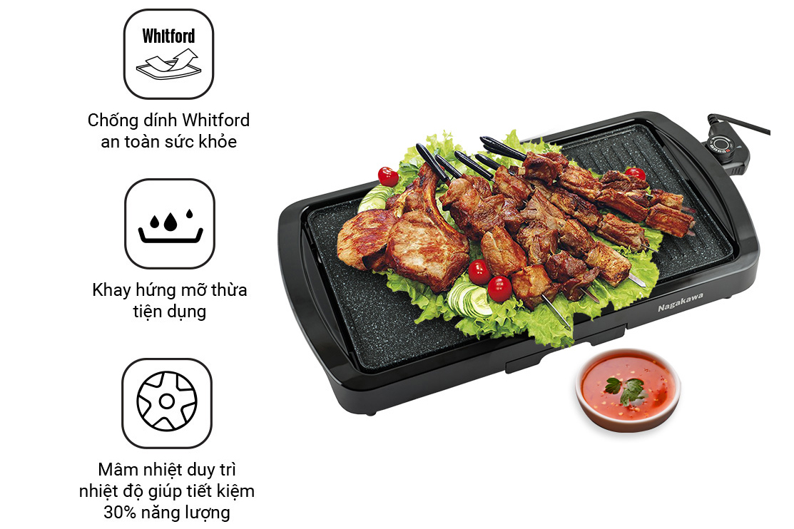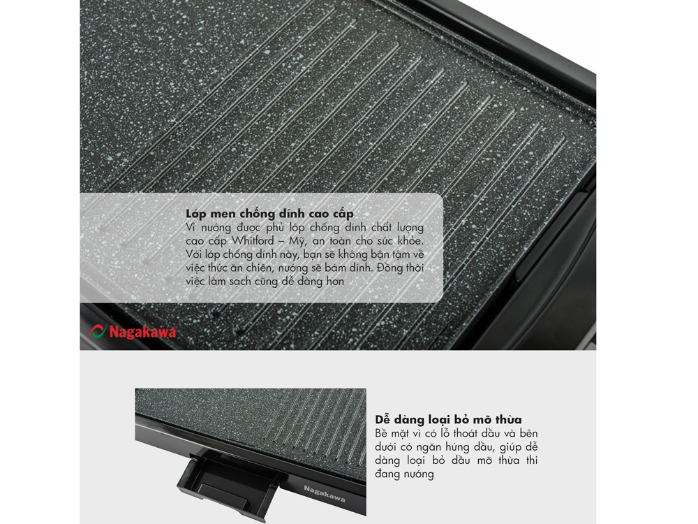Bếp nướng điện Nagakawa NAG3101 hay còn gọi là bếp nướng Nagakawa 3101. Đây là một trong những model bếp nướng bán chạy nhất của thương hiệu Nagakawa, Việt Nam. Với công suất hoạt động mạnh mẽ lên tới 1.650W cùng khả năng giữ nhiệt hiệu quả, Nagakawa NAG3101 có thể nướng thực phẩm chín đều, giữ trọn dinh dưỡng và tiết kiệm được tới 30% điện năng tiêu thụ. Đặc biệt, bề mặt bếp còn được làm bằng hợp kim siêu dày, có phủ chống dính Whitford cao cấp, đảm bảo an toàn cho sức khỏe của bạn.
