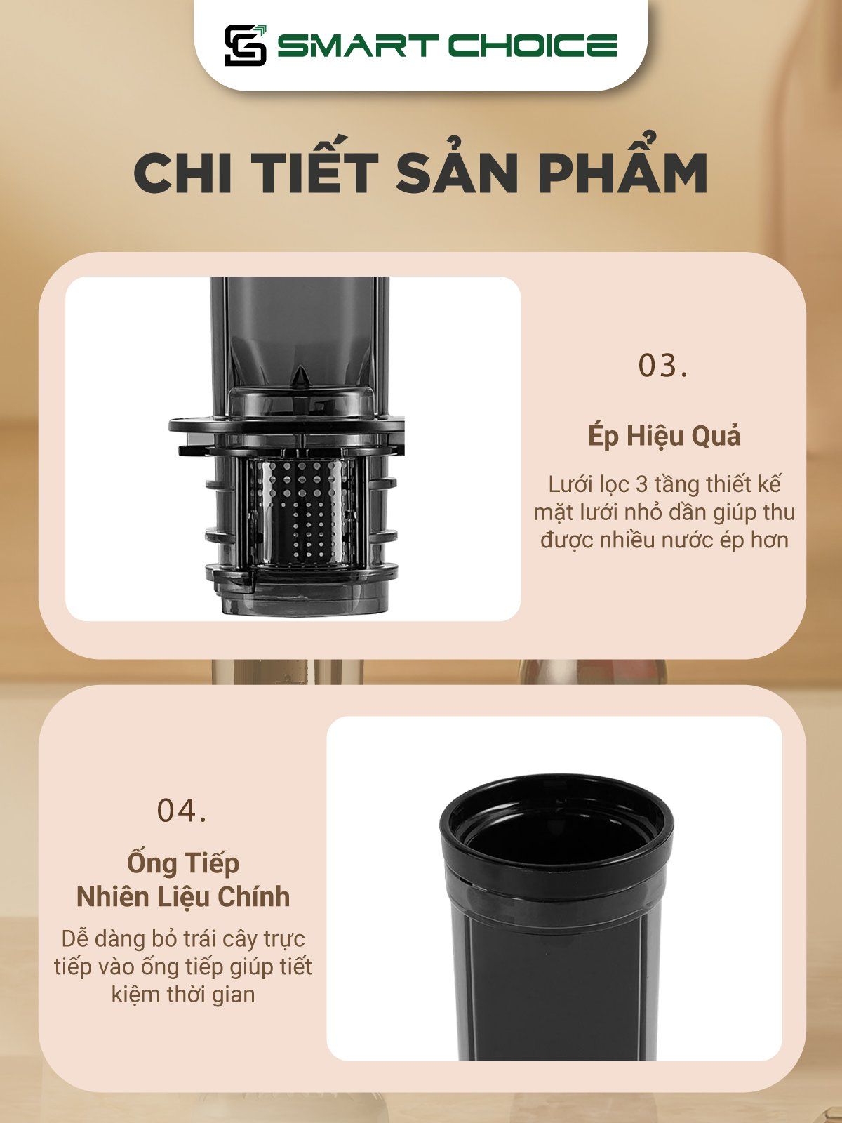 Máy ép chậm SmartChoice SCG-EC002 sử dụng công nghệ ép chậm tiên tiến, giúp giảm thiểu nhiệt sinh ra trong quá trình ép. Điều này giúp giữ nguyên các enzyme và chất dinh dưỡng có trong thực phẩm, đảm bảo rằng bạn sẽ nhận được ly nước ép không chỉ ngon mà còn giàu dưỡng chất.