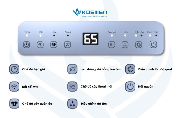 Máy hút ẩm mini Kosmen có chế độ tự động khởi động lại máy, dừng làm việc khi tank nước đầy, kết nối với ống xả thải ra bên ngoài, bộ nhớ lưu lại lịch sử làm việc.